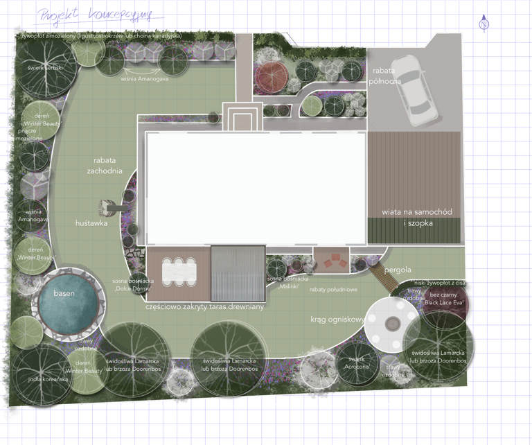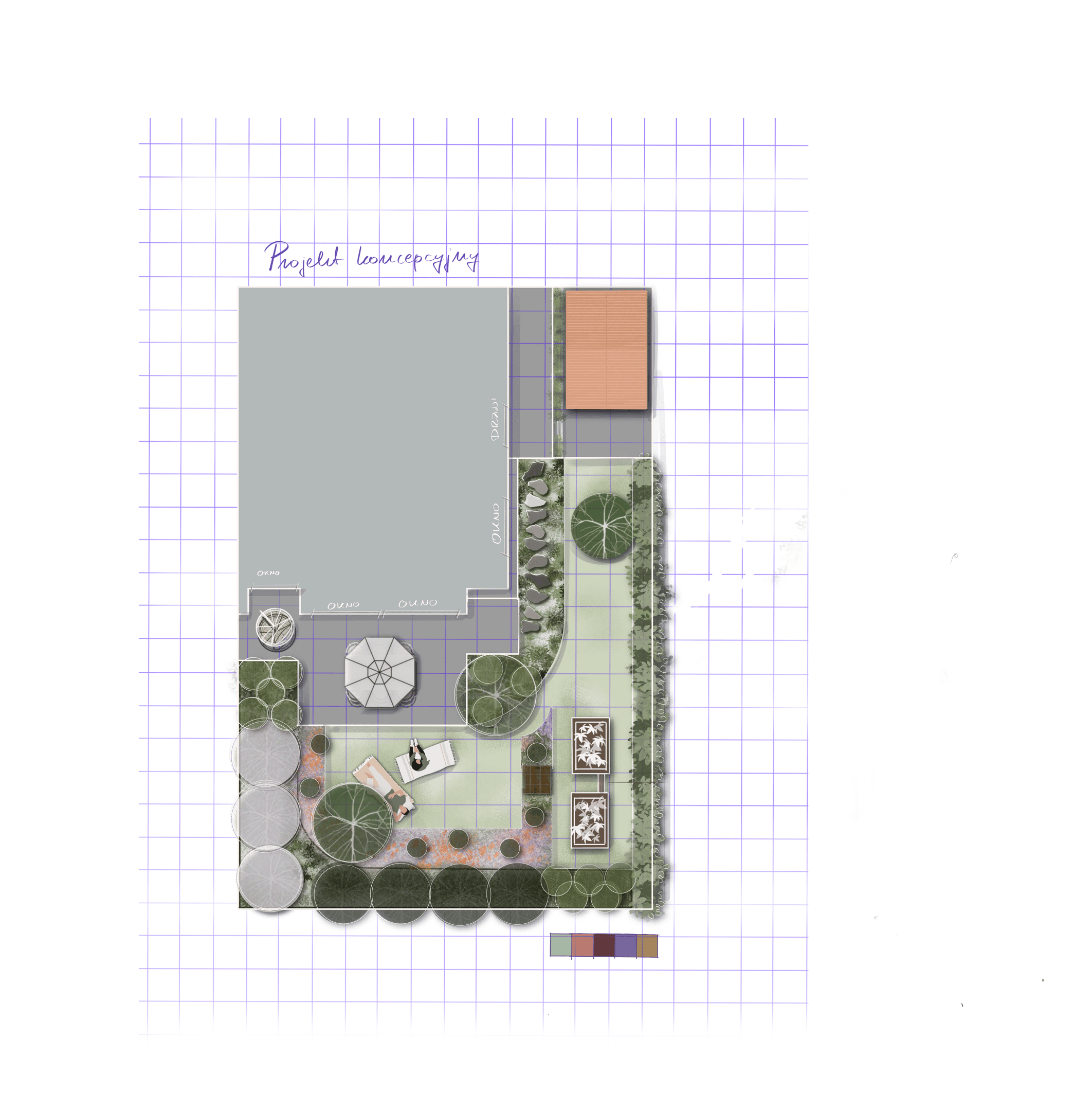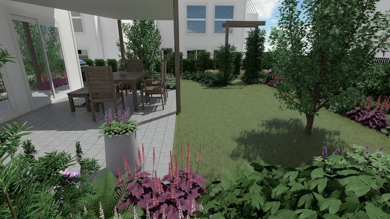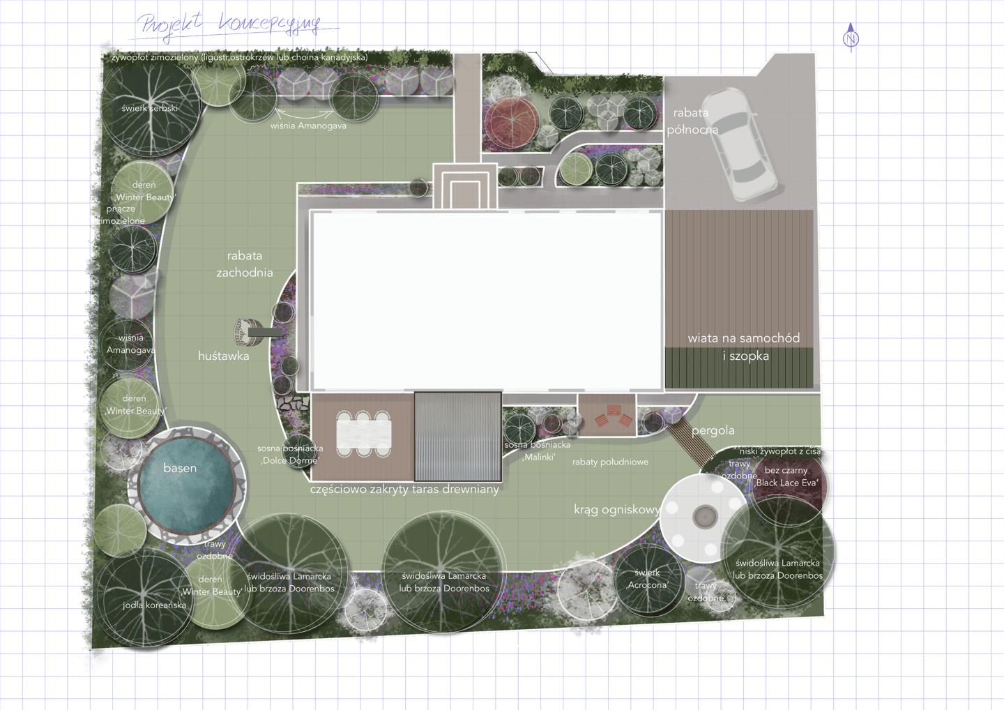Proponowane są nasadzenia z dużych drzew, które wprowadzą naturalny cień, a dodatkowo przysłonią widok na bardziej użytkowe części ogrodu oraz sąsiadujące domy.
