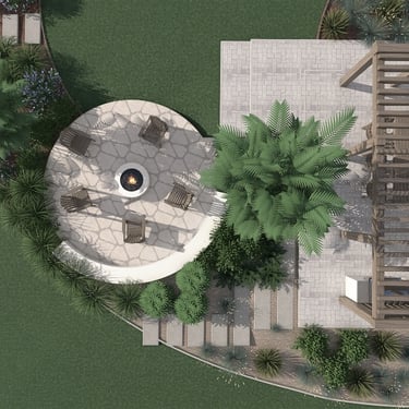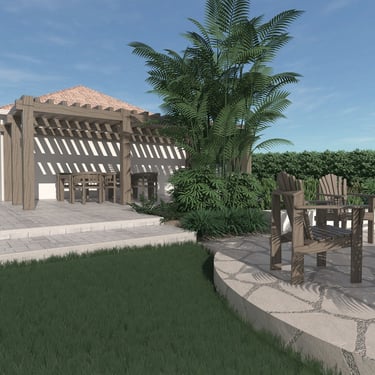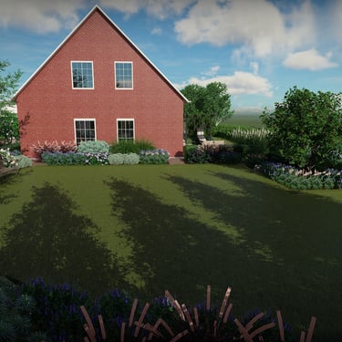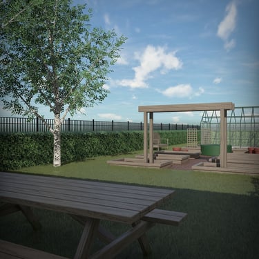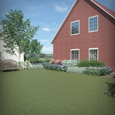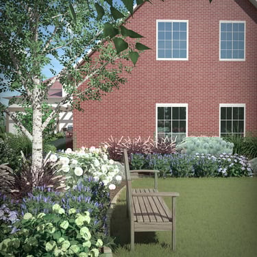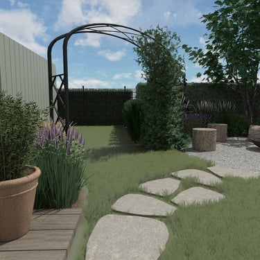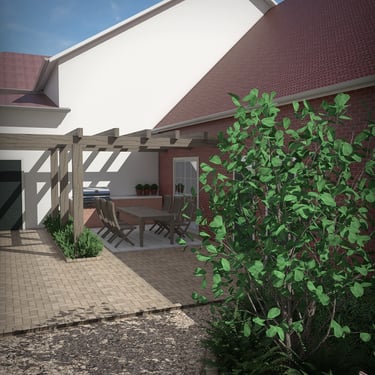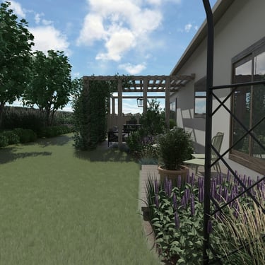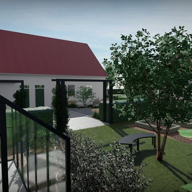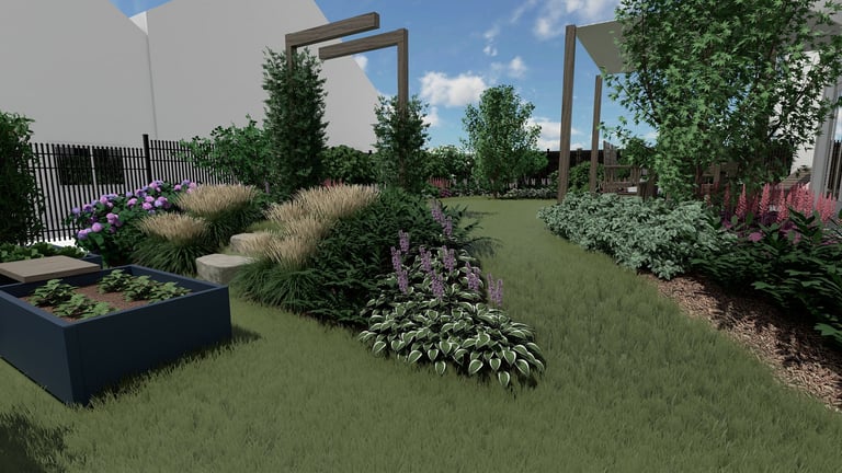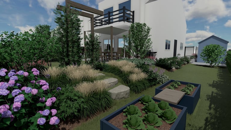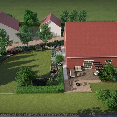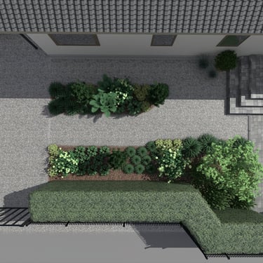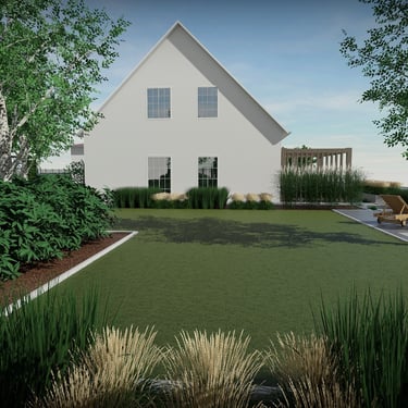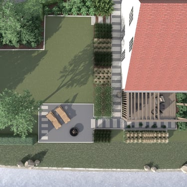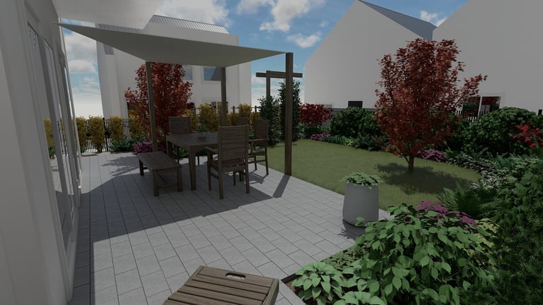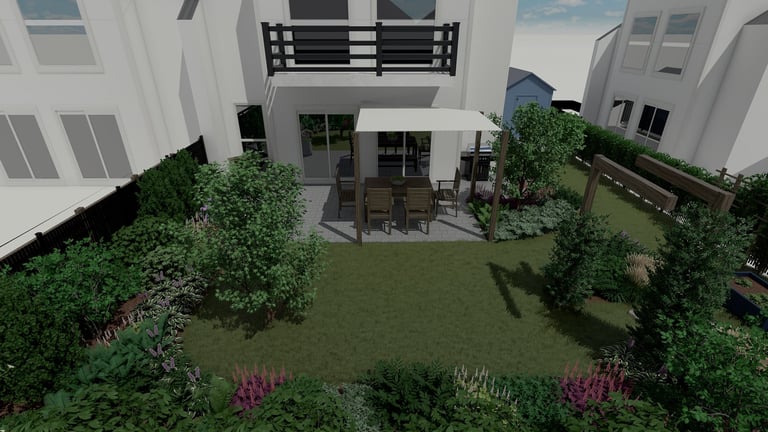 Proponowane są nasadzenia z dużych drzew, które wprowadzą naturalny cień, a dodatkowo przysłonią widok na bardziej użytkowe części ogrodu oraz sąsiadujące domy.