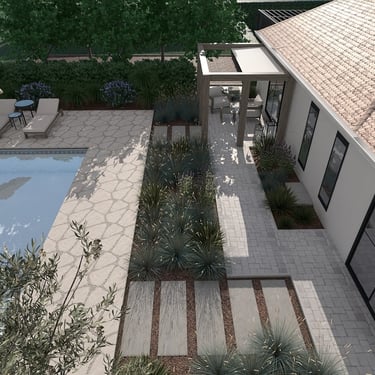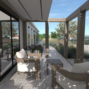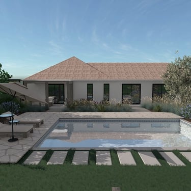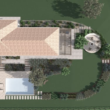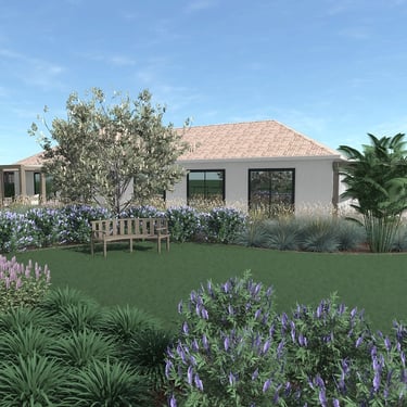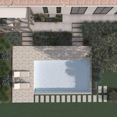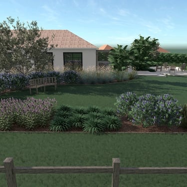 Z kolei rabaty z wieloletnich roślin śródziemnomorskich (odpornych na małą dostępność wody) są zaprojektowane tylko przy domu i miejscach wypoczynku. Dzięki temu, każdy widok z okna jest wzbogacony o dekoracyjne nasadzenia i choć rabaty nie zajmują bardzo dużych powierzchni, to dom ma sprawiać wrażenie 'zanurzonego w roślinach'.