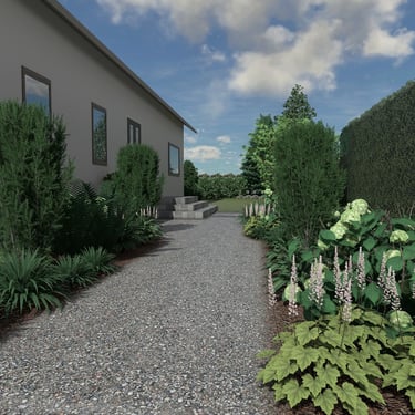 Na tle zimozielonej ściany z krzewów jest zaplanowana rabata, na której pysznią się gatunki preferujące półcieniste stanowisko, jak: hakonechloe, paprocie, zawilce, żuraweczki, tawułki, bez czarny.