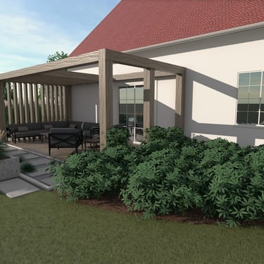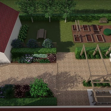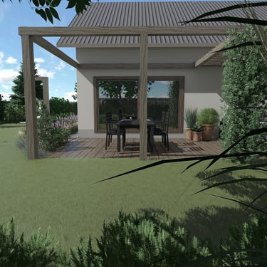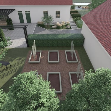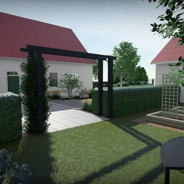 W rabacie po po prawej stronie zaprojektowana jest pergola, stanowiąca podporę dla pnącza i prowadząca do niewielkiego warzywnika w dwóch podwyższonych skrzyniach