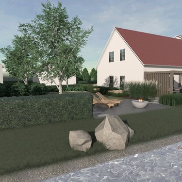 Koncepcja zakłada różnej wysokości przesłony z drzew i krzewów, tak, żeby zapewnić prywatność, ale też znacząco otwiera się na rzekę. Ruch i zmienność w ogrodzie dają pojedyncze drzewa liściaste i rabaty z traw, które są łatwe w założeniu i utrzymaniu.