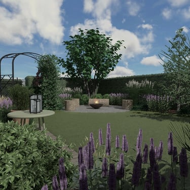 Ogród znajduje się w umiarkowanie gęstej zabudowie osiedla domków jednorodzinnych, ale ma być miejscem dającym wrażenie zielonego azylu odciętego od oczu przechodniów i sąsiadów.