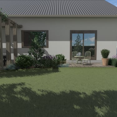 Wyzwaniem jest duży problem z dostępnością wody do podlewania roślin latem oraz tymczasowy charakter inwestycji - właściciele nie wykluczają, że w przyszłości się przeprowadzą. W efekcie ogród musi być stosunkowo uniwersalny, a ponadto ma adekwatnie podnieść wartość inwestycji przy potencjalnej sprzedaży.