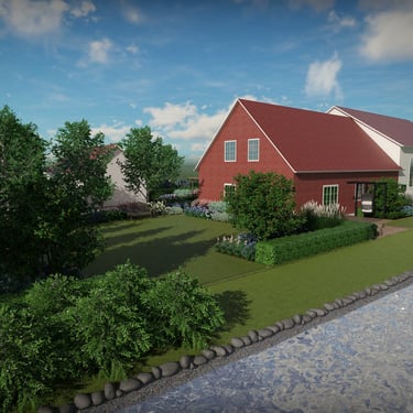 Nasadzenia wzdłuż granic ogrodu składają się z roślin iglastych, liściastych drzew i krzewów oraz bylin, tak, aby efekt prywatności był zachowany również zimą. Swobodne linie zachęcają do spaceru. Rabaty bylinowe wokół domu stworzą wspaniałą scenerię do odpoczynku na tarasach.